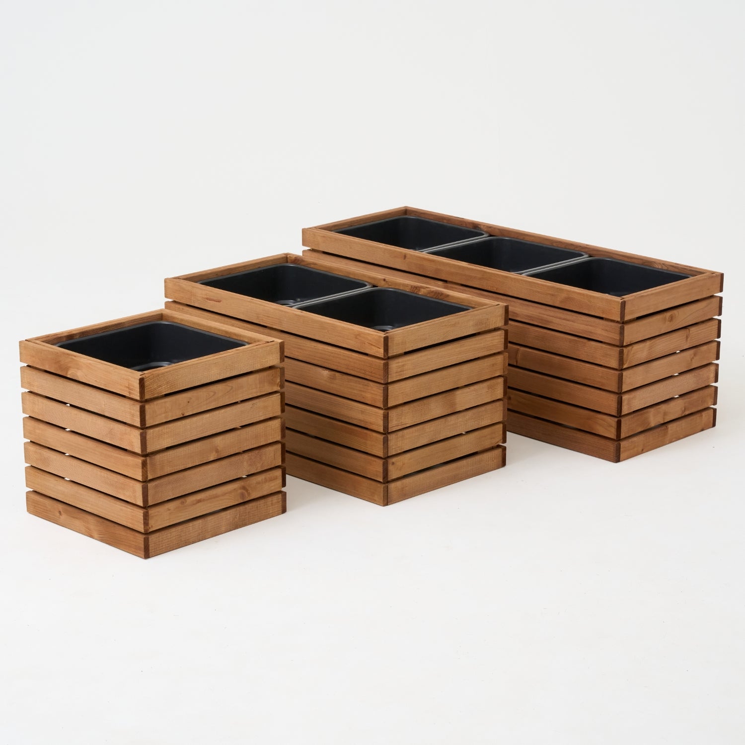 100% polská výroba, tlaková impregnace a vyjímatelné vložky. Kupujete si je na roky dopředu. Levnější plastové květináče často po jedné sezóně vyblednou, zdeformují se na slunci a v zimě praskají.