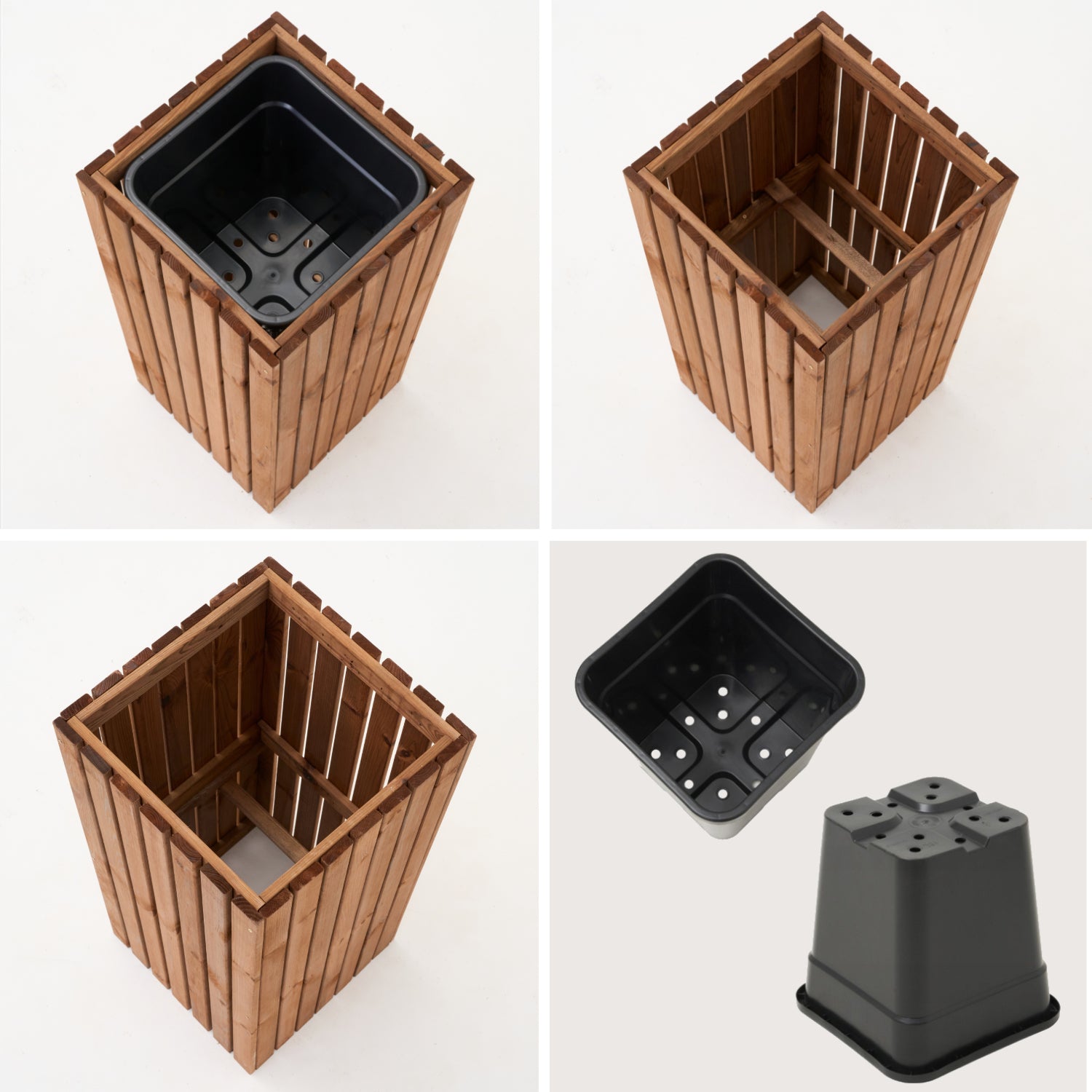 100% polská výroba, tlaková impregnace a vyjímatelné vložky. Kupujete si je na roky dopředu. Levnější plastové květináče často po jedné sezóně vyblednou, zdeformují se na slunci a v zimě praskají.