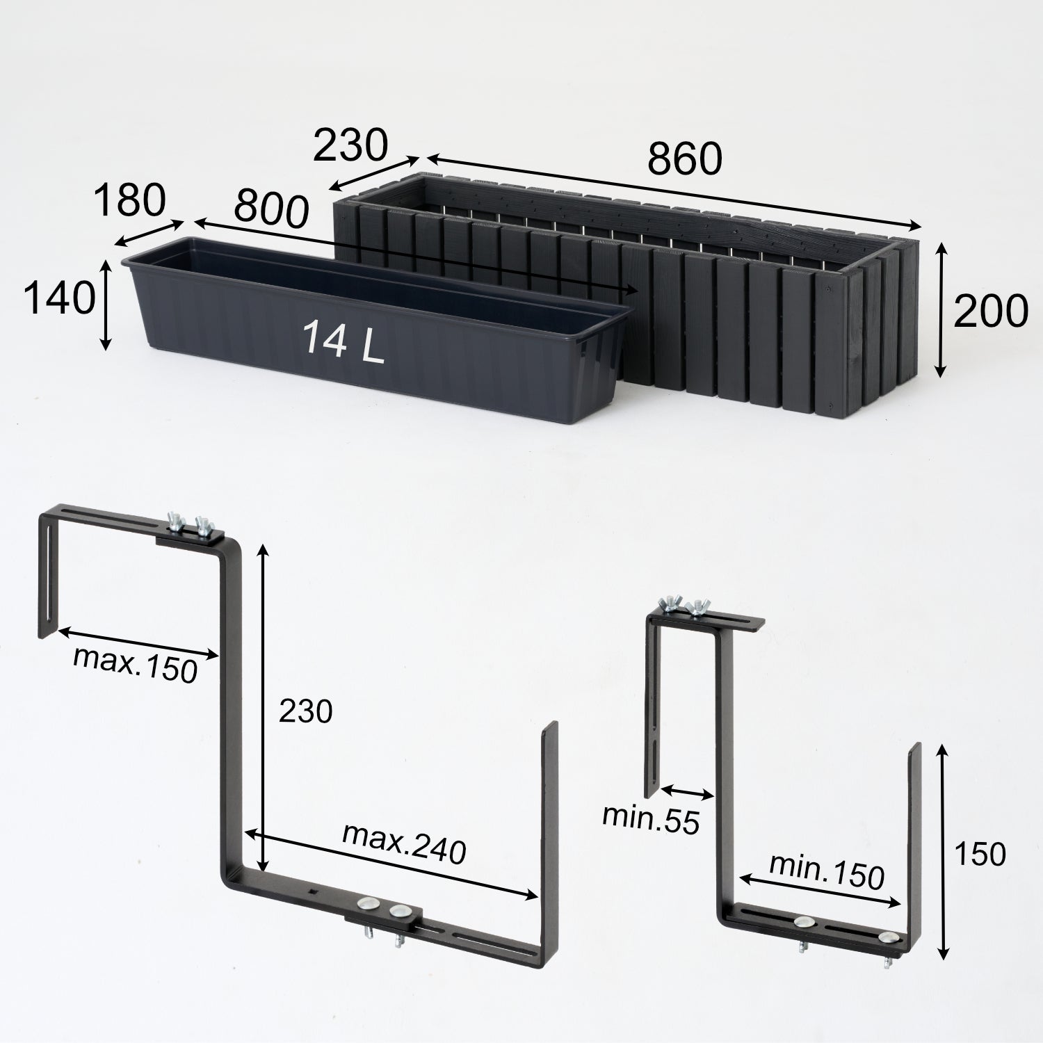 Maceta de balcón 86 cm antracita + inserto 14 l + asa balcón terraza