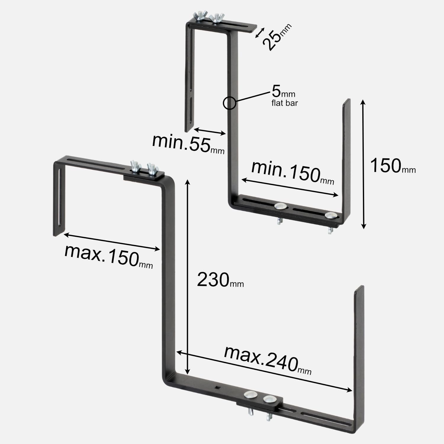 Dlaczego to najlepszy wybór? Konstrukcja z płaskownika 25 mm sprawia, że uchwyty nie wyginają się pod ciężarem. Dzięki szerokiemu zakresowi regulacji zamontujesz je na balustradach o szerokości do 15 cm oraz dopasujesz do dużych donic o głębokości od 15 do 24 cm. Malowanie proszkowe na głęboki czarny mat zapewnia pełną odporność na rdzę, deszcz i mróz przez wiele sezonów.