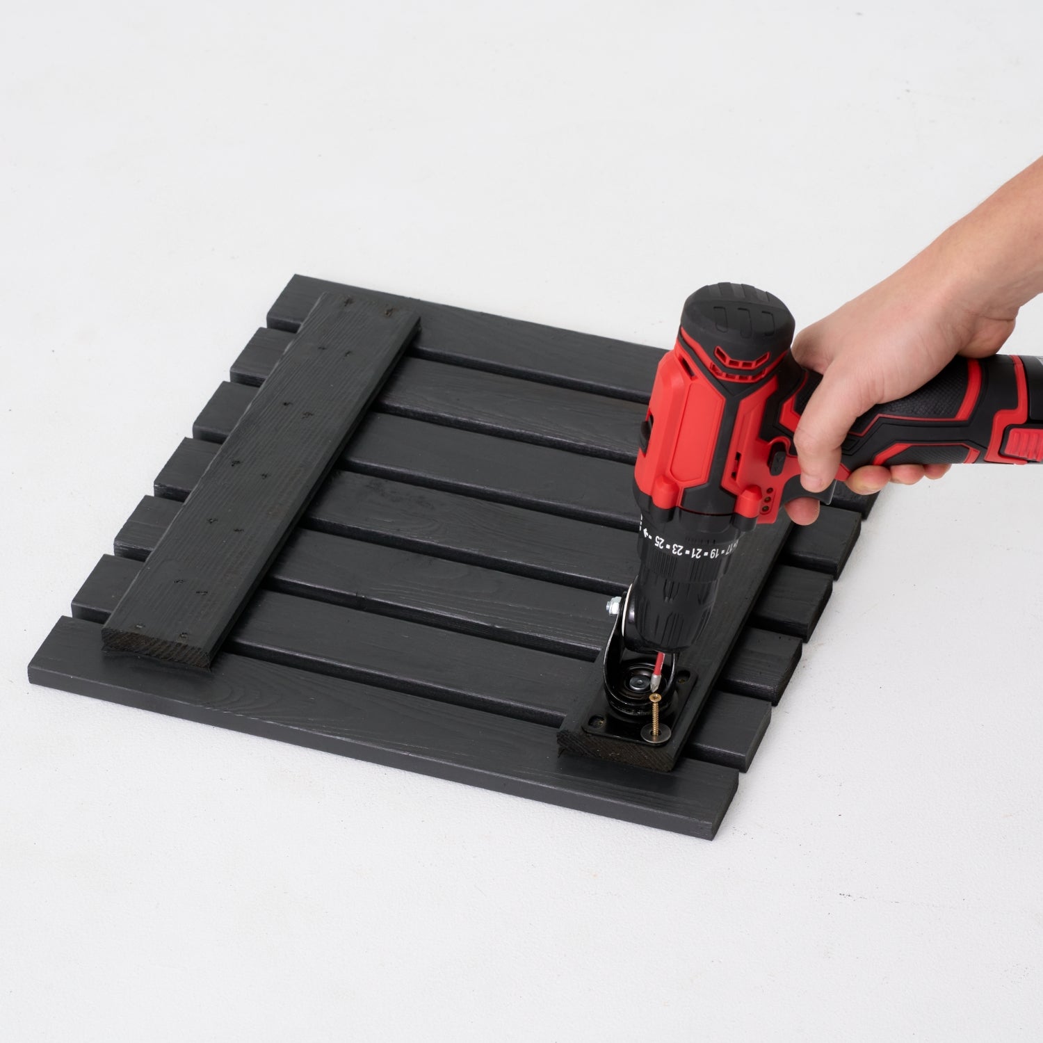 - Powoli dokręcaj wkręt za pomocą wkrętarki, dbając o równomierne i stabilne zamocowanie kółek.